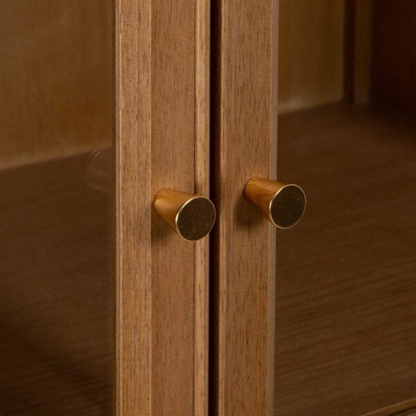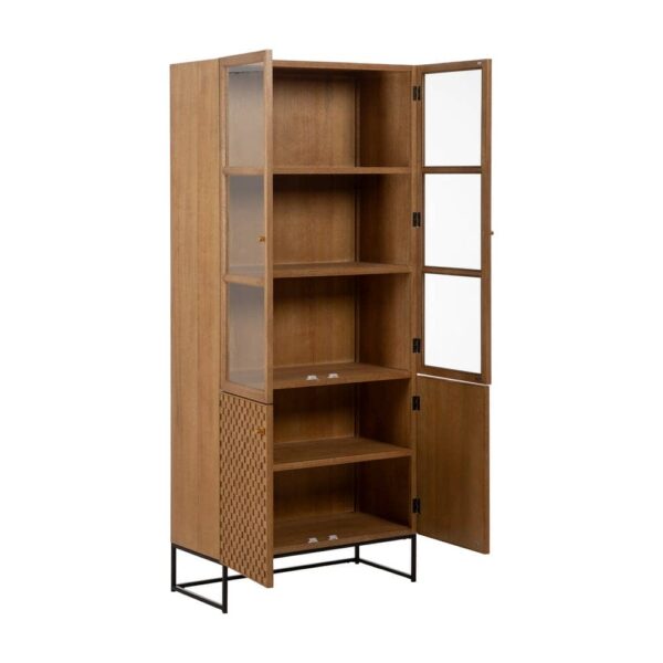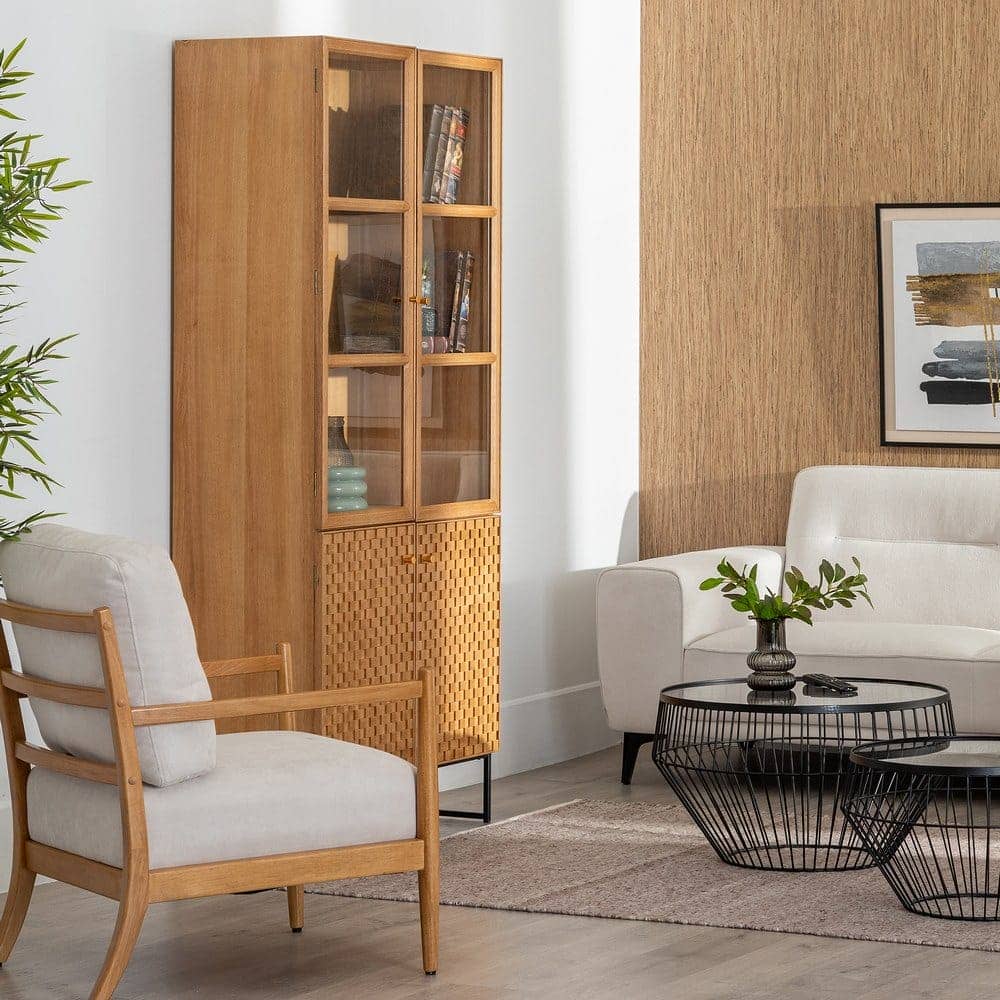 Esta vitrina combina lo mejor de los materiales con DM, madera de fresno y un toque de metal (hierro) que le da una robustez y belleza única. Su acabado en natural resalta las características de la madera, aportando luminosidad y calidez. Con medidas de 84,5 cm x 42,5 cm x 198 cm, es perfecta para espacios amplios, ideal para colocar en un salón moderno o un comedor elegante. Las puertas superiores de 42×118 cm y las puertas inferiores de 42×61 cm te permiten acceder fácilmente a su interior, mientras que las lejas interiores (con alturas de 38.5 cm, 38.5 cm, 40 cm arriba y 29.5 cm abajo) ofrecen una gran versatilidad para almacenar objetos de diferentes tamaños. Con patas de 18,5 cm y un peso de 47 kg, esta vitrina es tan resistente como atractiva. Patas para montar para facilitar su transporte. ¡Hazla tuya y disfruta de su sofisticado diseño en tu hogar!